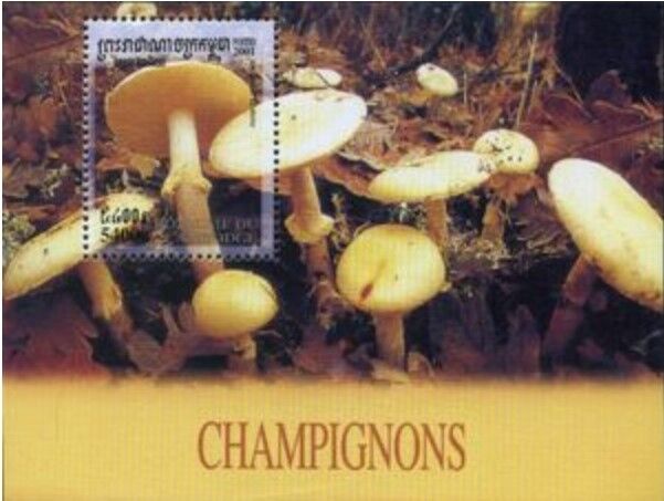 切手は2001年カンボジア発行の「キノコ切手小型シート」で、タマゴテングタケが描かれています。