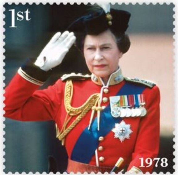 切手は2022年イギリス発行の「エリザベス2世プラチナ・ジュビリー切手」の中の一枚で、1978年年6月に行われた誕生日パレード(トゥルーピング・ザ・カラー)のイギリス軍の礼装スタイルのエリザベス2世が描かれています。