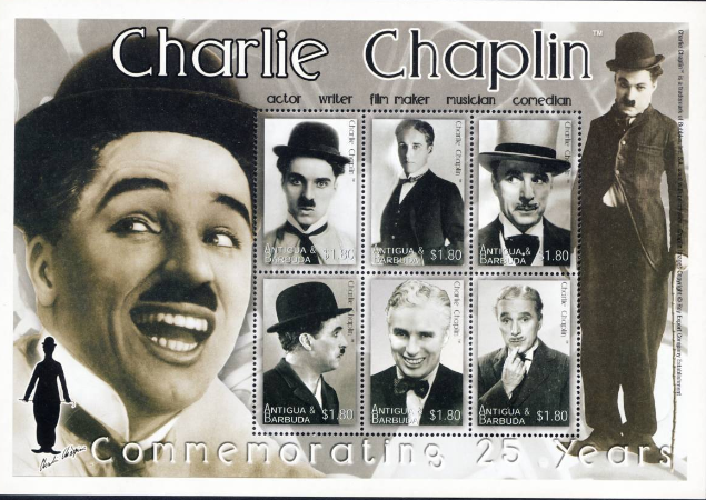 切手は2002年アンティグア・バーブーダ発行の「チャールズ・チャップリン没後25年連刷切手」で、チャップリンが描かれています。