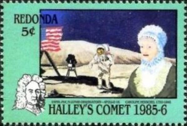 私が知る限りキャロライン・ハーシェルの切手は発行されていないようですが、1986年レドンダ王国発行の「彗星切手」の中の一枚で、切手右にカロライン・ハーシェルらしき人物が描かれています。