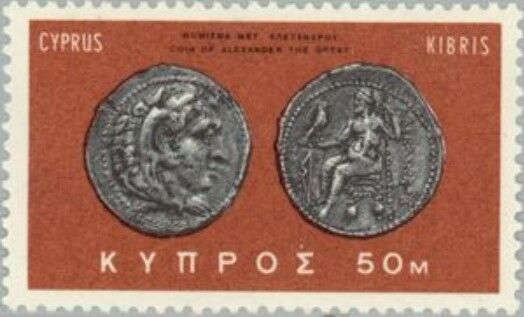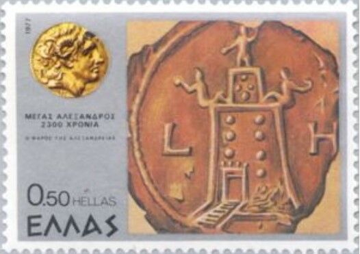 切手は1954年ギリシャ発行の「古代ギリシャ美術切手」の中の一枚で、アレキサンダー大王の横顔が描かれています。